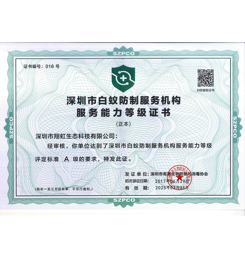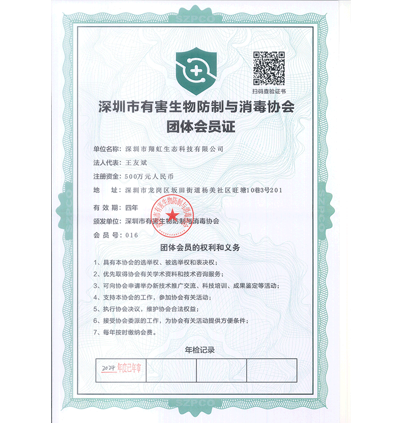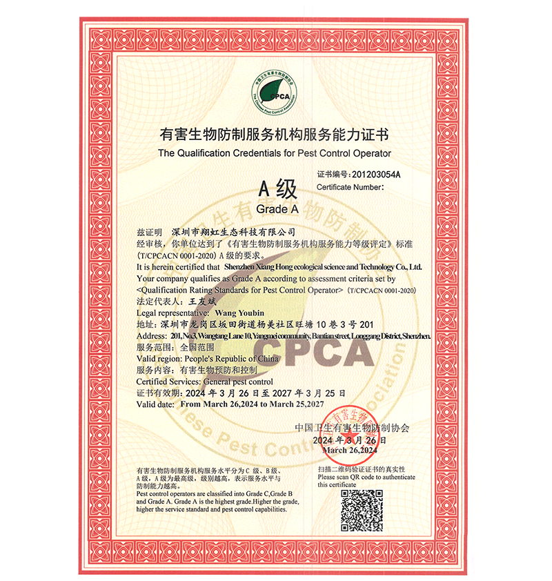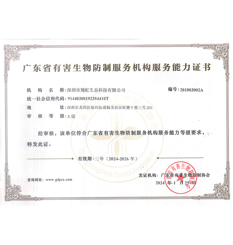 深圳市翔虹生態(tài)科技有限公司成立于1995年,是深圳最早成立的專業(yè)蟲害防治公司之一。公司發(fā)展至今獲得全國有害生物防制服務(wù)A級(jí)資質(zhì)、廣東省有害生物防制服務(wù)A級(jí)資質(zhì)、深圳市有害生物防制服務(wù)A級(jí)資質(zhì)、廣東省有害生物防制服務(wù)A級(jí)資質(zhì)、深圳市有害生物防制服務(wù)甲級(jí)資質(zhì)的單位,是中國有害生物防治協(xié)會(huì)會(huì)員、廣東省有害生物防治協(xié)會(huì)會(huì)員、深圳市有害生物防治協(xié)會(huì)理事單位,多次獲得“深圳市十佳消殺單位”榮譽(yù)。
